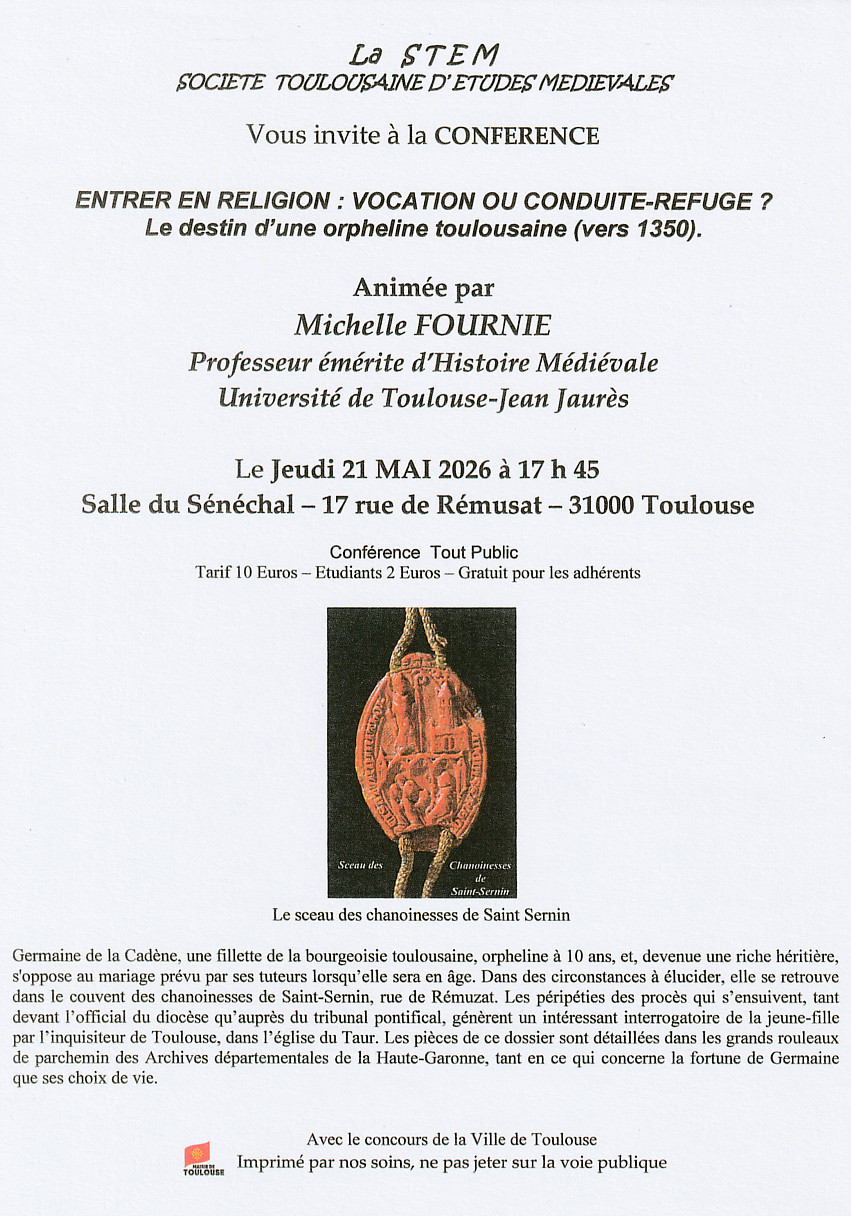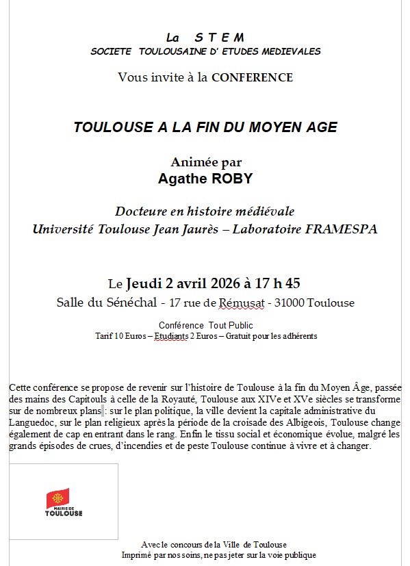 - Mercredi 09 Février 2022 à 17H45 :Toulouse: Capitale culturelle et artistique à la fin du Moyen Age, animée par Sophie Brouquet, professeur en histoire à l’ université Jean Jaurès à Toulouse.