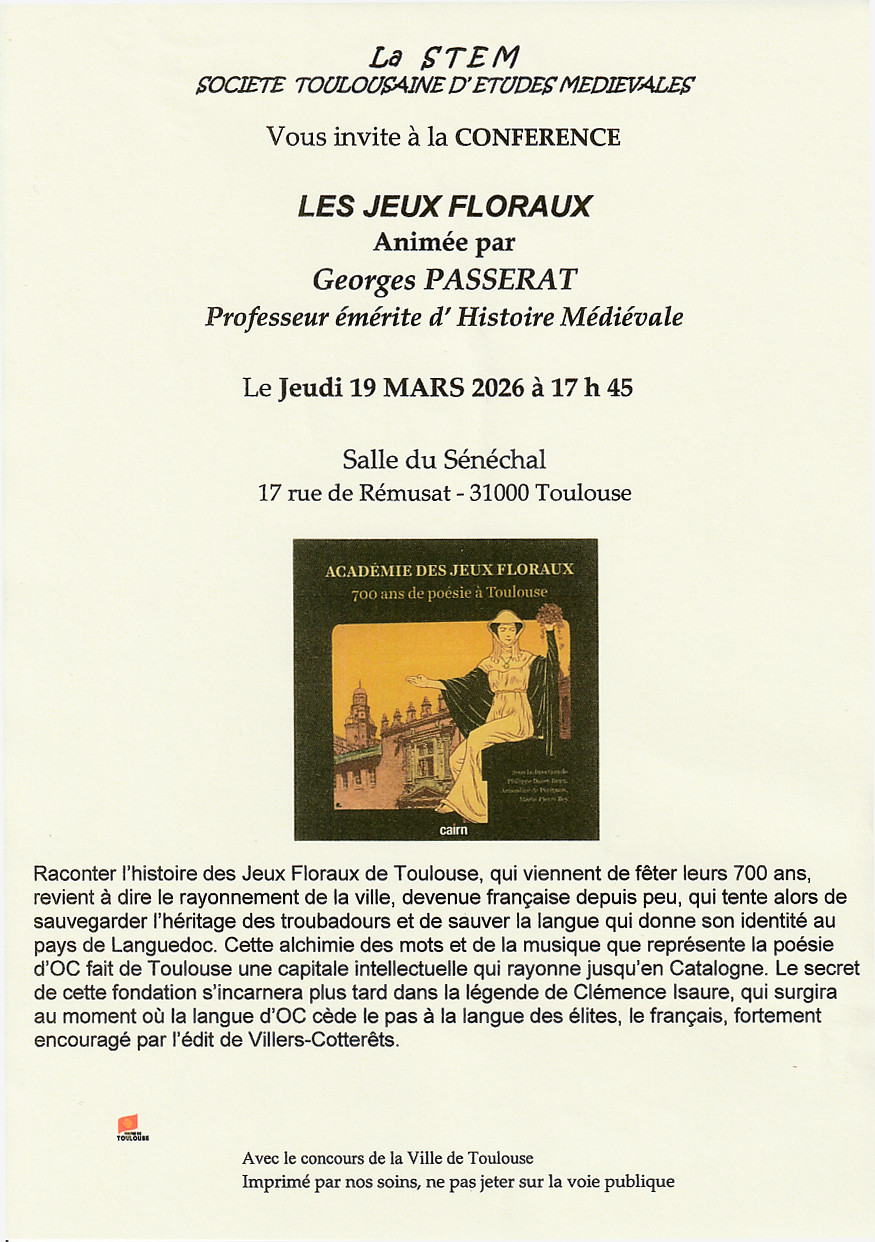 - Conférence du jeudi 19 Mars 2026 à 17 heures 45, la salle étant ouverte à partir de 17 heures 30 : « Les Jeux Floraux » animée par monsieur Georges Passerat. Au lieu habituel salle du Sénéchal et tarifs habituels, flyer ci-après :